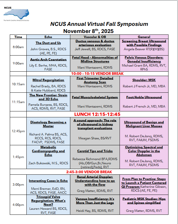 NCUS is proud to continue hosting a variety of presenters geared towards different modalities and all levels of sonography. Follow our social media to stay up to date on presenters, topics, CMEs, and registration! A brochure of lecture offerings will be out soon!!